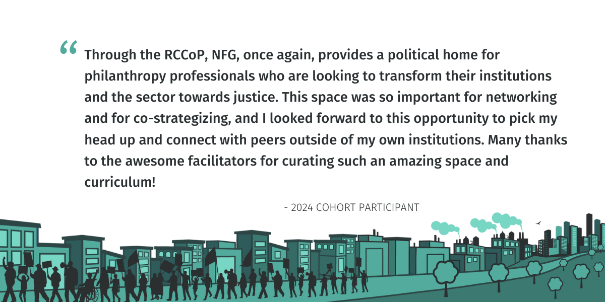 - Solidarity: $4,500 (If you support our goal to build progressive philanthropy through political education and funder-organizing training, this level will enable us to offer RCCoP next year to more folks in philanthropy who are looking for a political home)